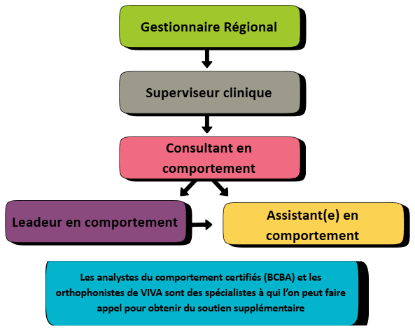 L’équipe qui entoure un enfant est composée d’un superviseur clinique (SC), d’un consultant en comportement (CC) et d’assistants en comportement, qui sont responsables de la mise en œuvre directe des interventions. Cette équipe a pour objectif d’optimiser l’apprentissage de l’enfant en adaptant son programme et en créant de nombreuses occasions d’apprentissage de haute qualité au cours des séances. De plus, un soutien supplémentaire peut être fourni par le BCBA (analyste du comportement certifié) et par des spécialistes en orthophonie, selon les besoins de l’enfant.